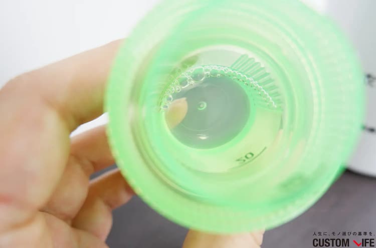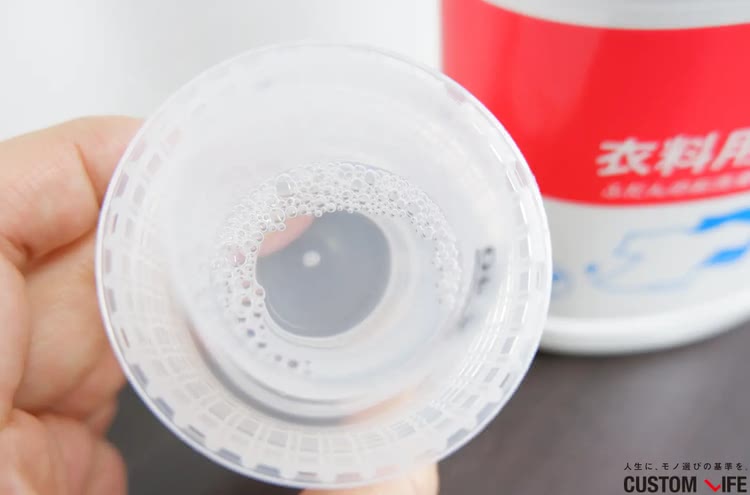 液の色は透明で、つんとしたニオイもほとんどしません。キャップも大きめで計量しやすいですよ。